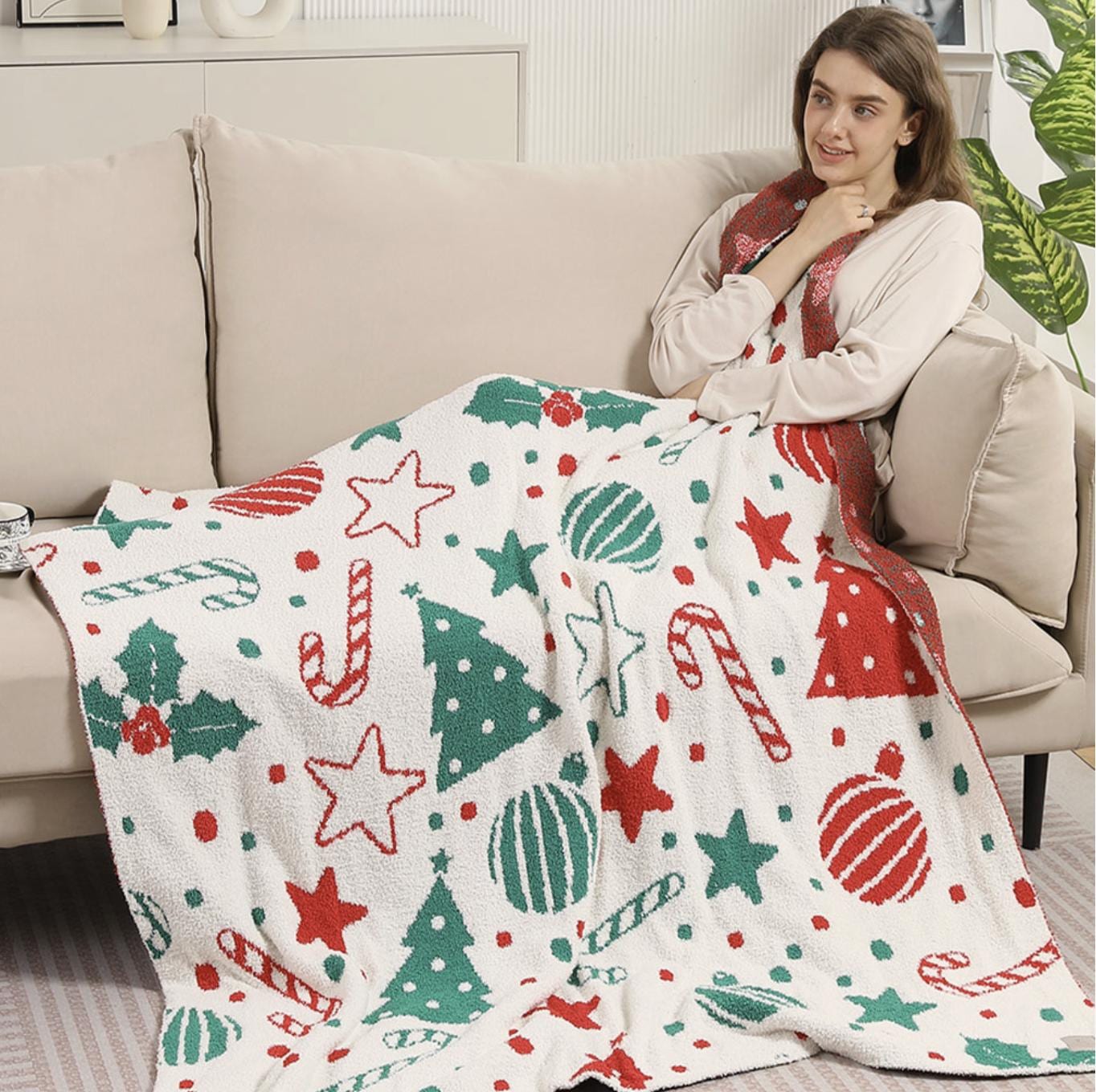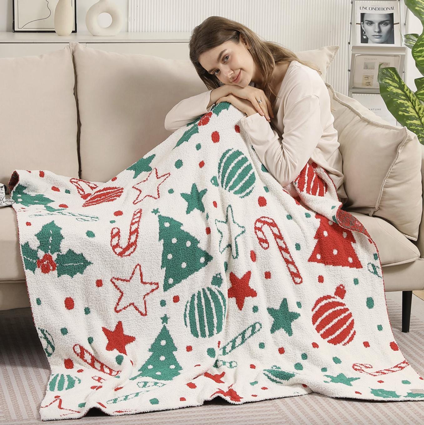 Size : 50" X 60" Material : 100% Poly. Microfiber Care: Machine Wash - Cold, Do Not Bleach, Lay Flat To Dry, Do Not Iron, Do Not Dry Clean Soft and cozy Christmas throw blanket featuring festive holiday prints like stars, trees, and candy canes. Perfect for decorating your sofa or snuggling up during the winter season.