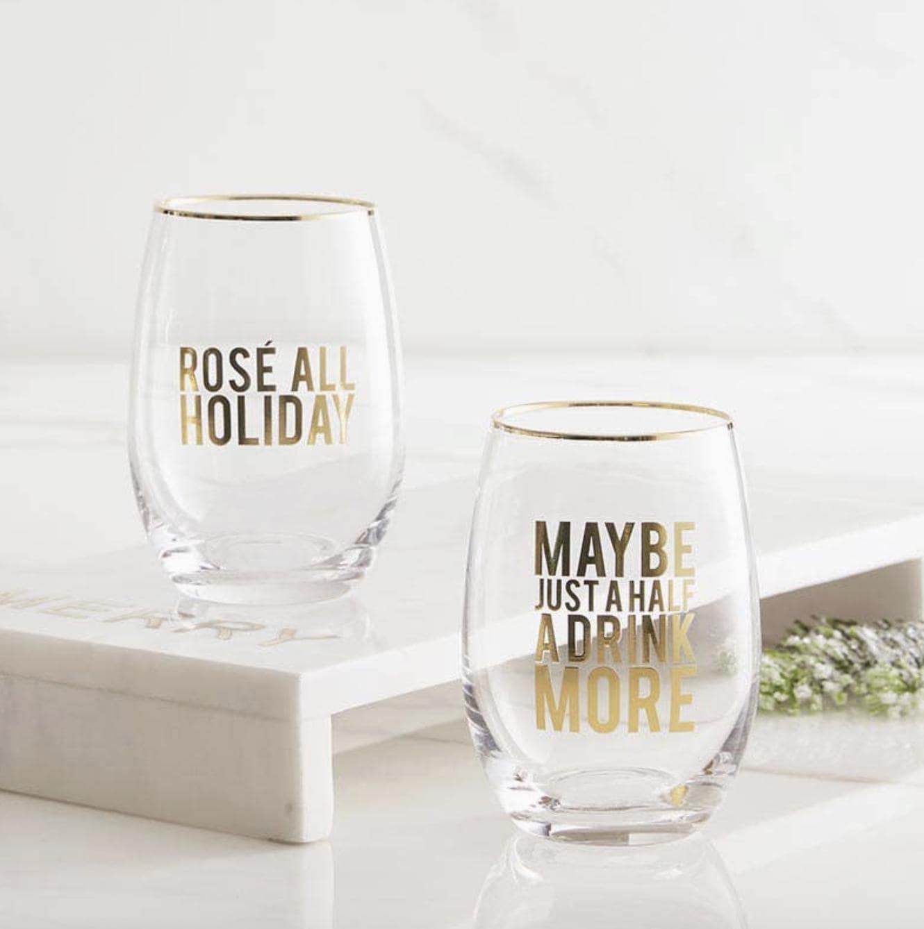 Elevate your glassware with our brushed metallic gold wine glasses. Adorable phrases for any occasion. Added rim detail sets these glasses aside from the rest. · Material: Glass/Cardboard Box · Size: 17 oz / 4.5" H · Care Instructions: Hand Wash Only