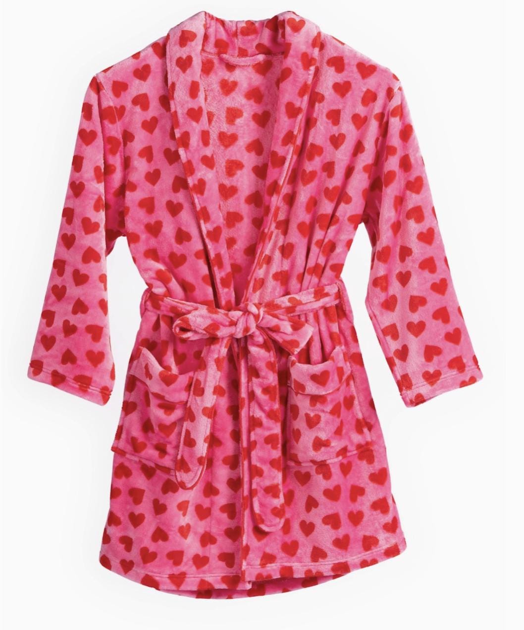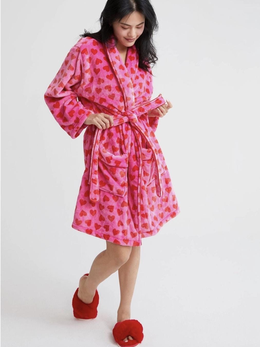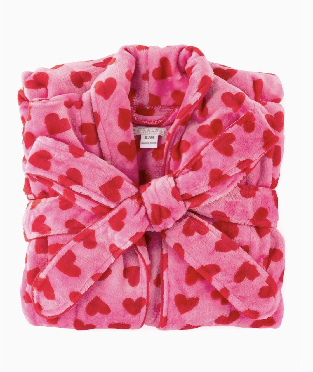 S/M: L 38”; L/XL: L 40”. Made from 100% polyester. Machine wash, tumble dry low, Wrap yourself in playful coziness with our Bow Robe, the perfect piece for lounging in style. Made from super soft fleece, this robe features a dreamy pink hue sprinkled with bright red bow prints for a fun, feminine touch. Complete with a tie belt and roomy front pockets, it’s designed for ultimate comfort and convenience. Whether you’re sipping coffee or opening gifts, this robe brings the cozy vibes all season long.