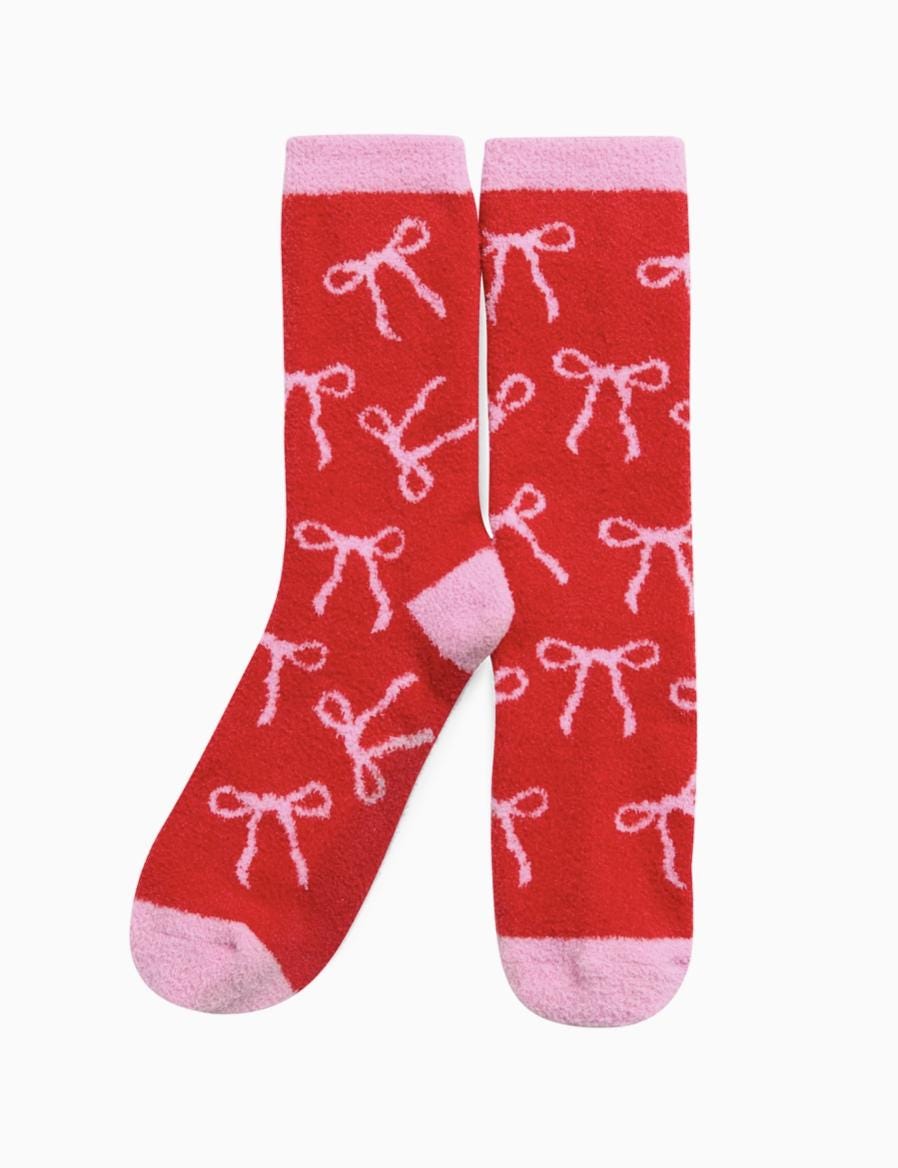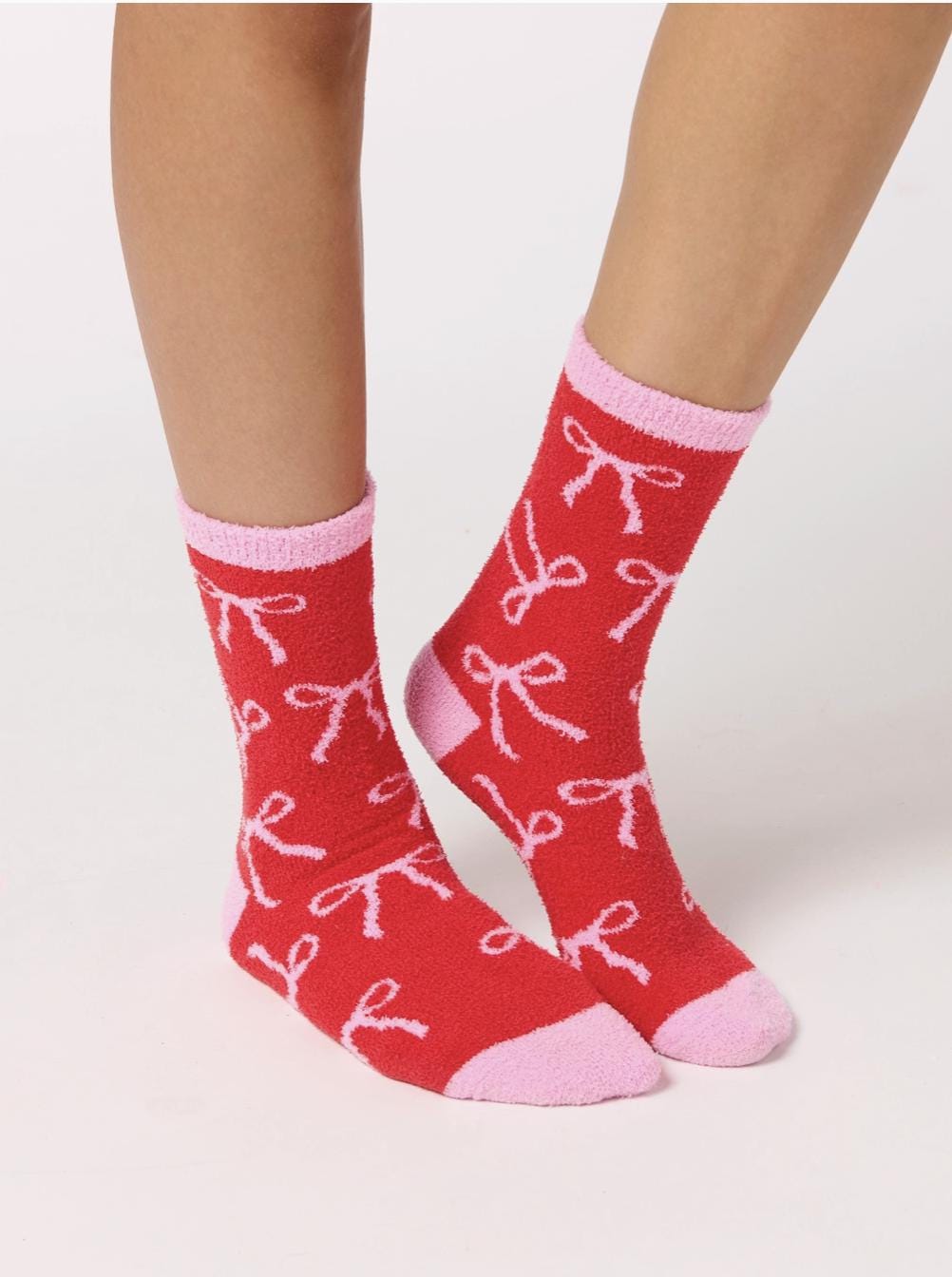 Fits size 5-10Made from polyester and spandex, Wrap your feet in cuteness with the Bow Socks, the ultimate cozy accessory for your lounging lineup. Featuring an all-over pink bow print against a festive red background, these socks bring the perfect pop of charm to your winter wardrobe. The contrast heel, toe, and cuff add a playful touch while keeping things comfy and snug. Made from ultra-soft material, they’re as fun to wear as they are to gift.