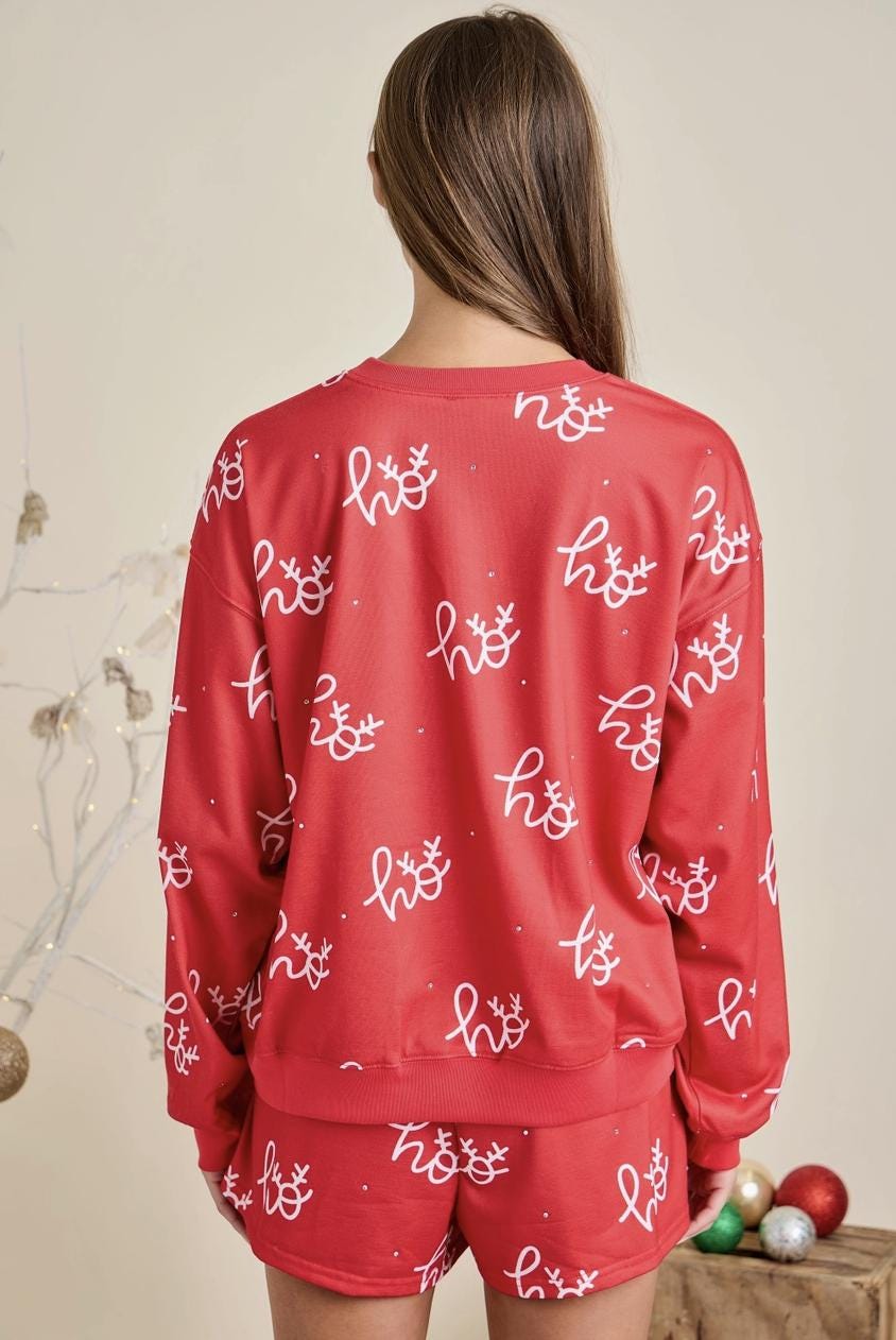 ho ho ho sweatshirt, holiday pullover, red lounge top, ready to ship, ships fast, boutique apparel, ATS knitwear, cozy vibes, southern boutique apparel, festive print, christmas sweatshirt, in-stock favorite, holiday capsule, giftable apparel, cozy top, winter lounge, matching set, boutique bestseller, festive red, holiday outfit, Main strip