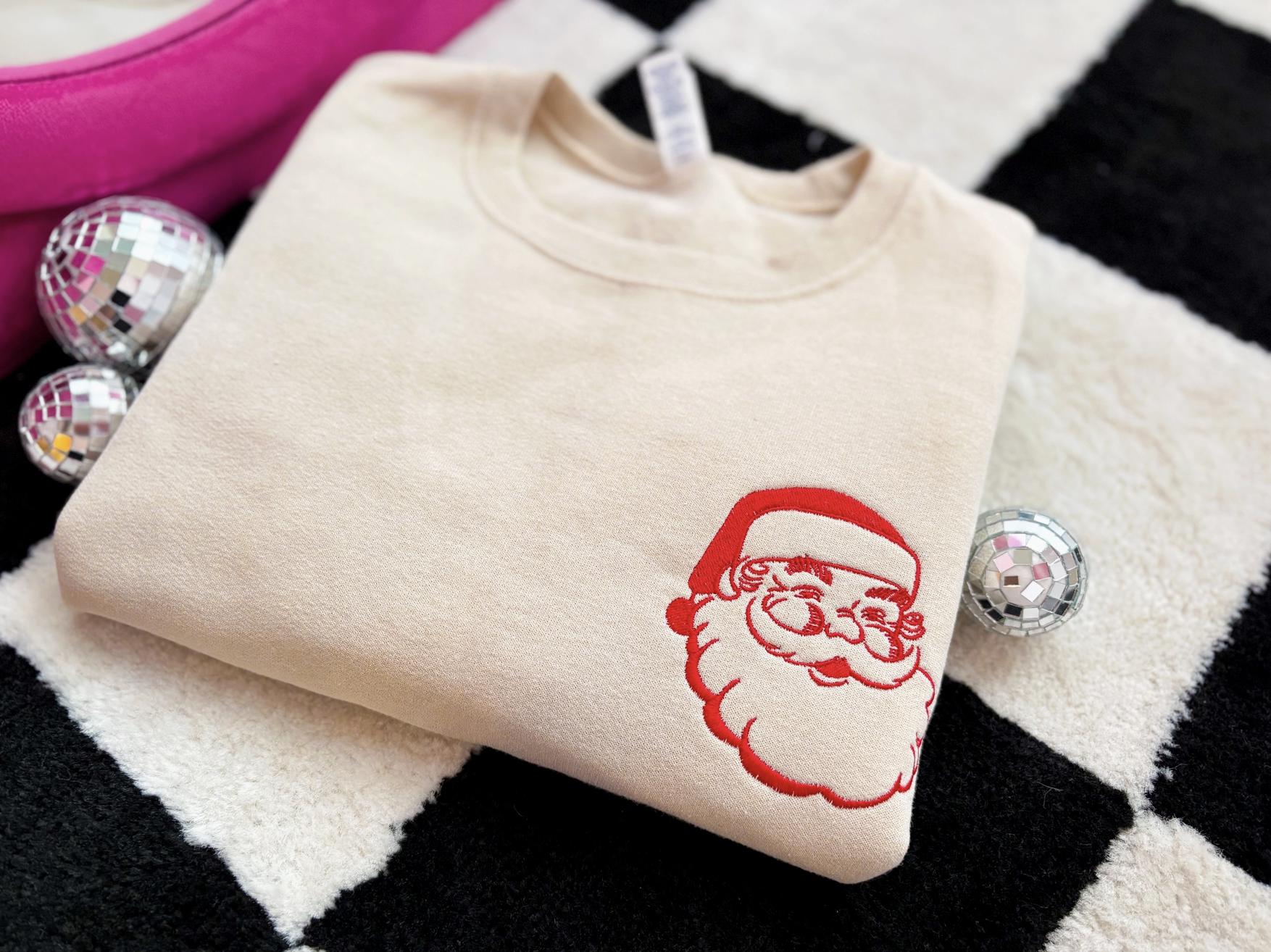 retro santa, embroidered crewneck, holiday sweatshirt, christmas apparel, wholesale crewneck, jerzees sweatshirt, vintage santa, boutique holiday, unisex sweatshirt, festive clothing, santa sweater, christmas gift, winter fashion, embroidered holiday, small business