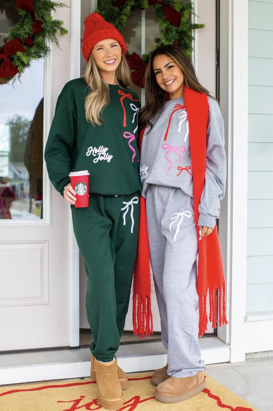 Get in the holiday spirit in our Holly Jolly Bow Set! 🎀 Featuring colorful PUFF bows and a playful “Holly Jolly” design, this cozy matching sweatshirt and sweatpants combo is perfect for Christmas shopping, movie marathons, or lounging by the tree. Whether you go for festive green or classic heather gray, you’ll be wrapped in comfort and holiday cheer all season long.