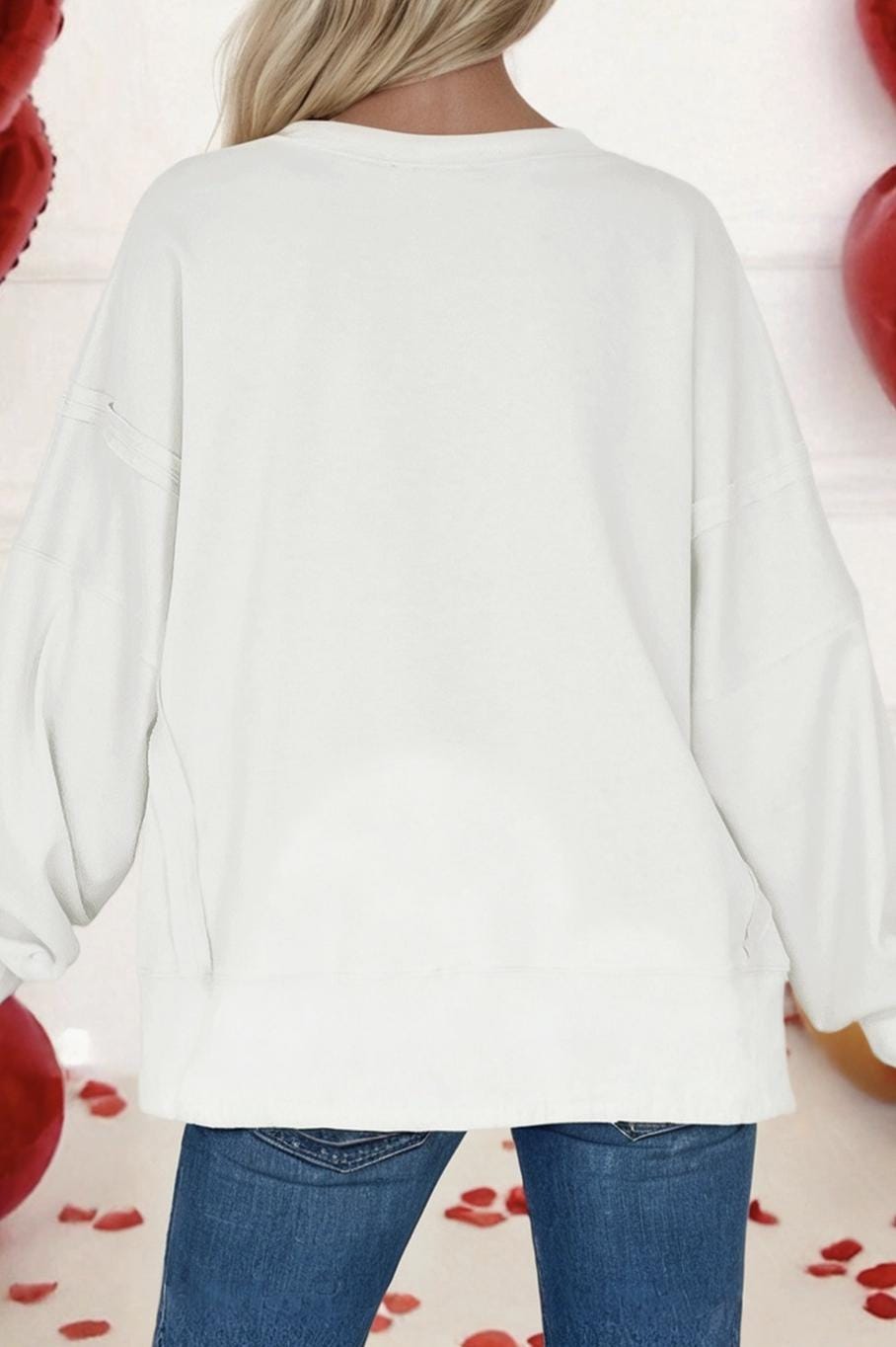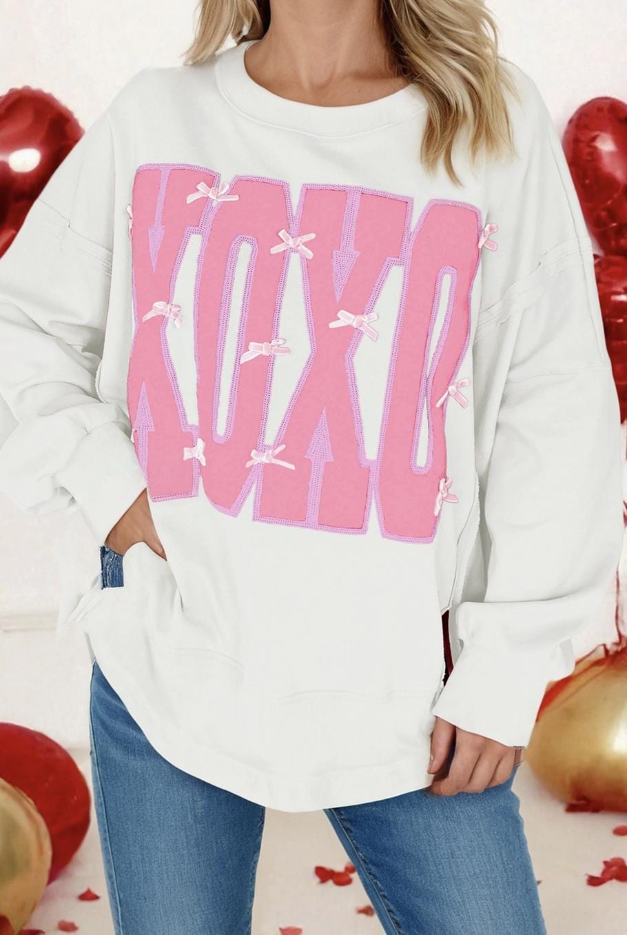 White Bow Sequin Xoxo Letter Graphic Exposed Seam Baggy Sweatshirt